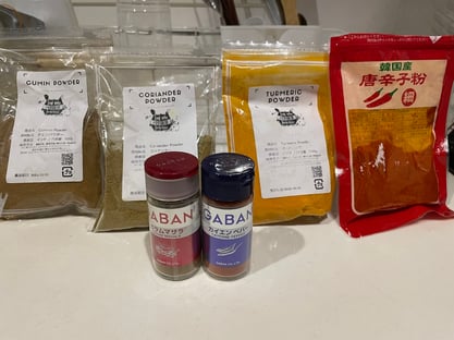 種明かしをすると、これだけのスパイスで、というか後ろの袋4つで美味しいカレーの味が決まります。クミン、コリアンダー、ターメリックに赤唐辛子。それにガラムマサラやカイエンペッパーを少々プラスしたり。あとは塩とブラックペッパーかな?